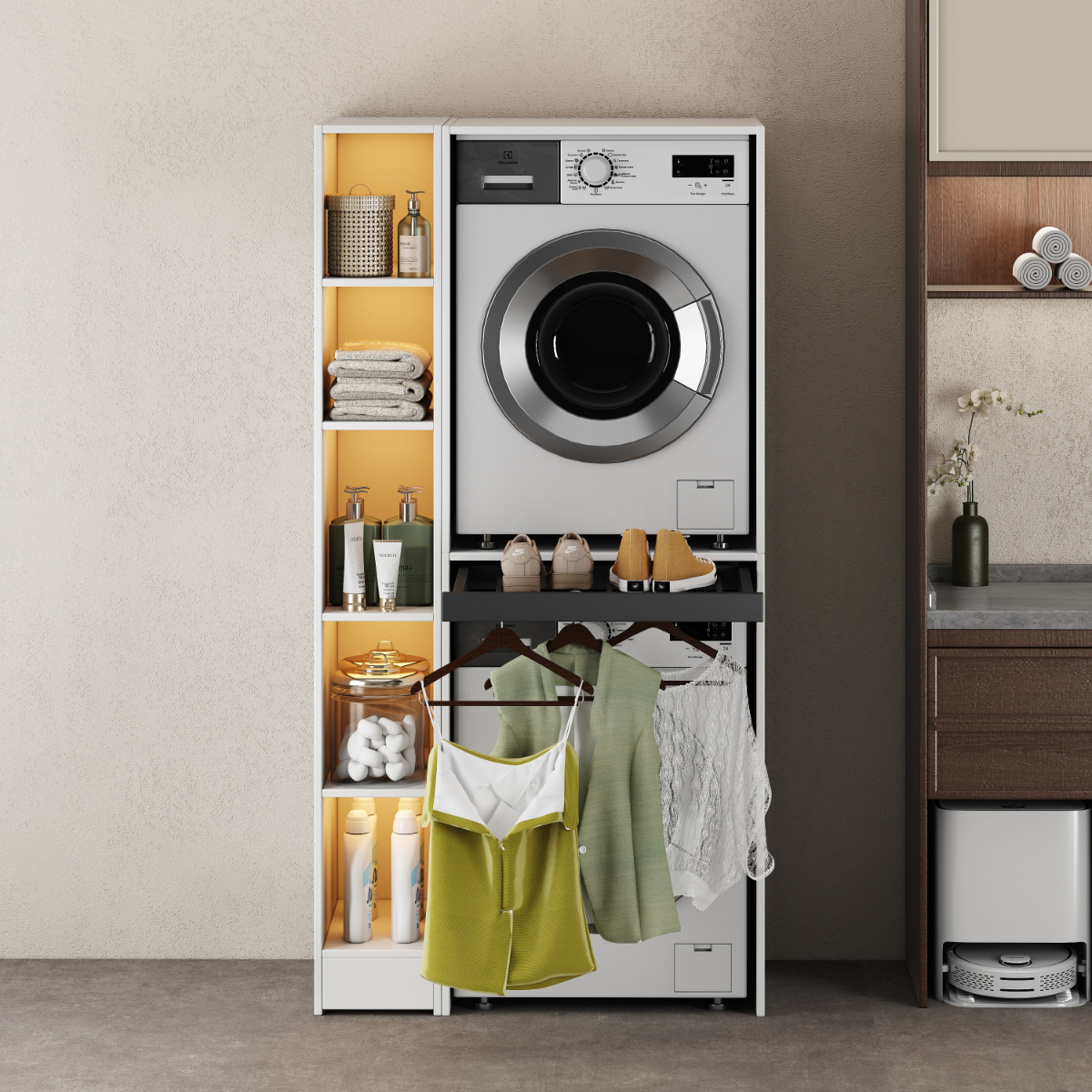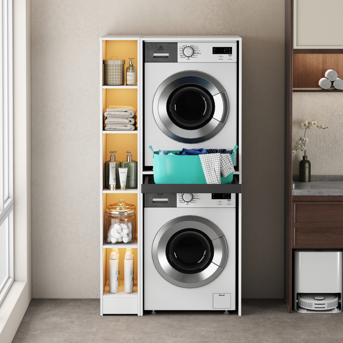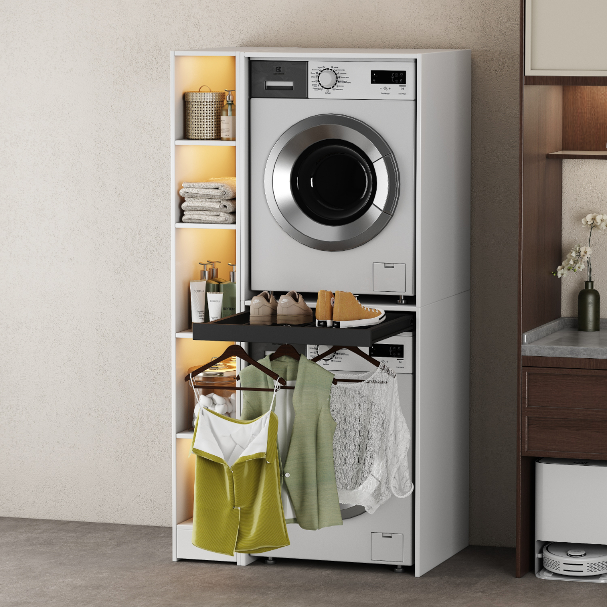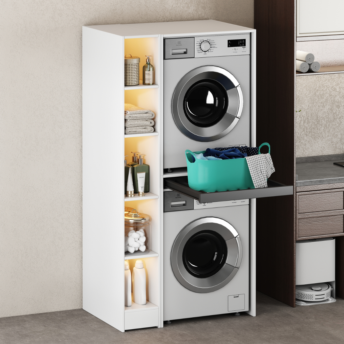The side cabinet is a perfect solution for storing washing detergent, towels, or other laundry accessories.