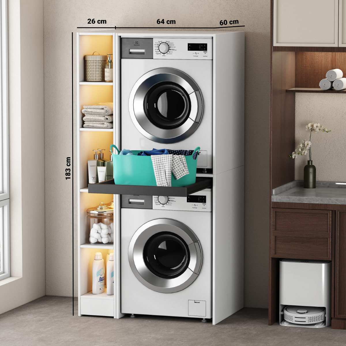 ELTO laundry cabinet is designed in Slovenia. The washer and dryer machine zone is made from 18 mm boards, and the middle part can support up to 120 kg of weight.