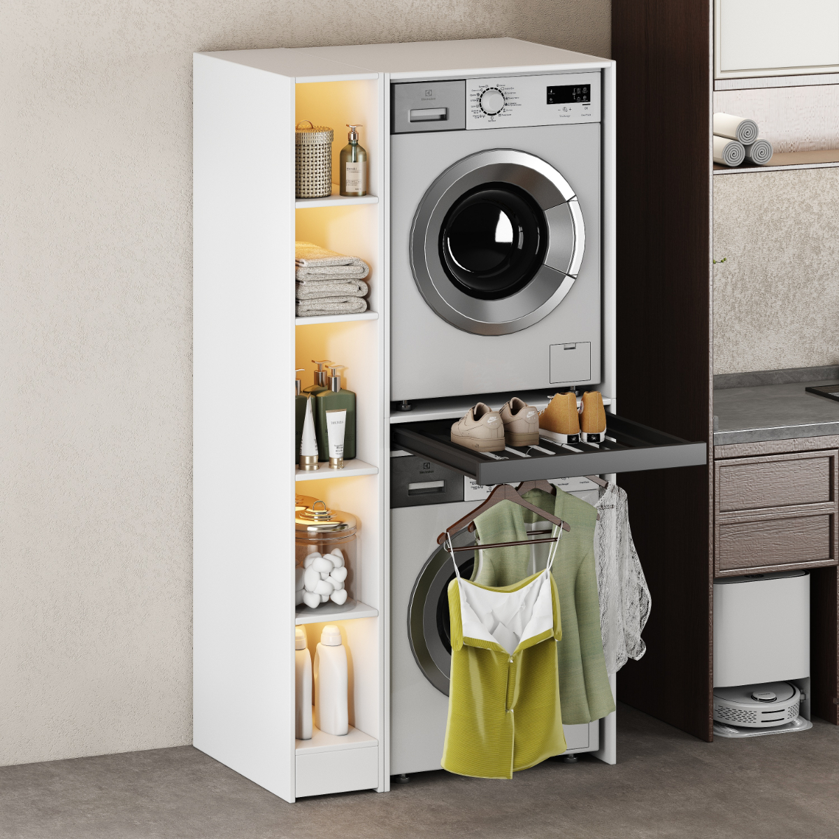 Cabinet for washing machine and dryer with foldable drawer, WHITE + side cabinet